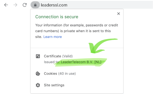 Informationen über das Unternehmen finden Sie auf der Registerkarte "Betreff" des Zertifikats. Außerdem wird der Firmenname in der Adressleiste des Browsers angezeigt.