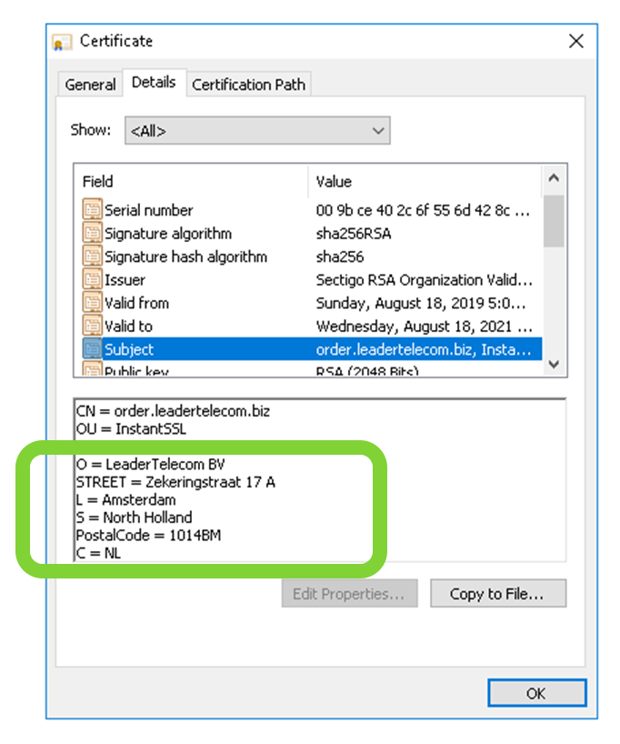 Informationen über das Unternehmen finden Sie auf der Registerkarte „Betreff“ des Zertifikats.